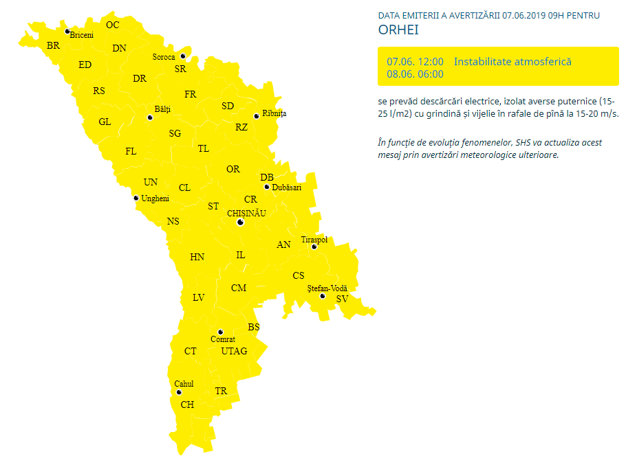 Avertizarea erste valabilă începând cu ora 12:00 și va fi valabilă până mâine la ora 06:00. În această perioadă se prevăd descărcări electrice, izolat averse puternice (15-25 l/m2) cu grindină și vijelie în rafale de până la 15-20 m/s.