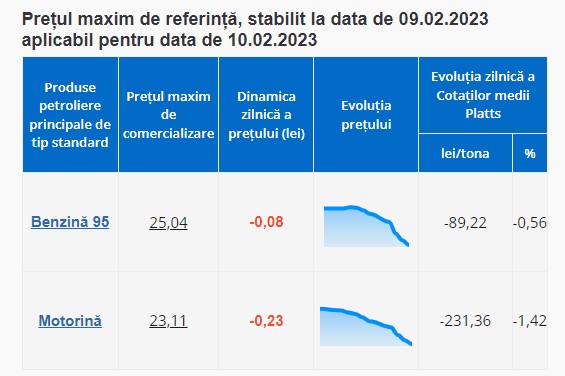 Astfel, benzina COR95 va costa în următoarea zi cel mult 25 de lei și 04 de bani per litru (cu 8 bani mai puțin decât azi). Motorina se ieftinește cu 23 de bani și va avea un preț maxim de 23 de lei și 11 de bani per litru.