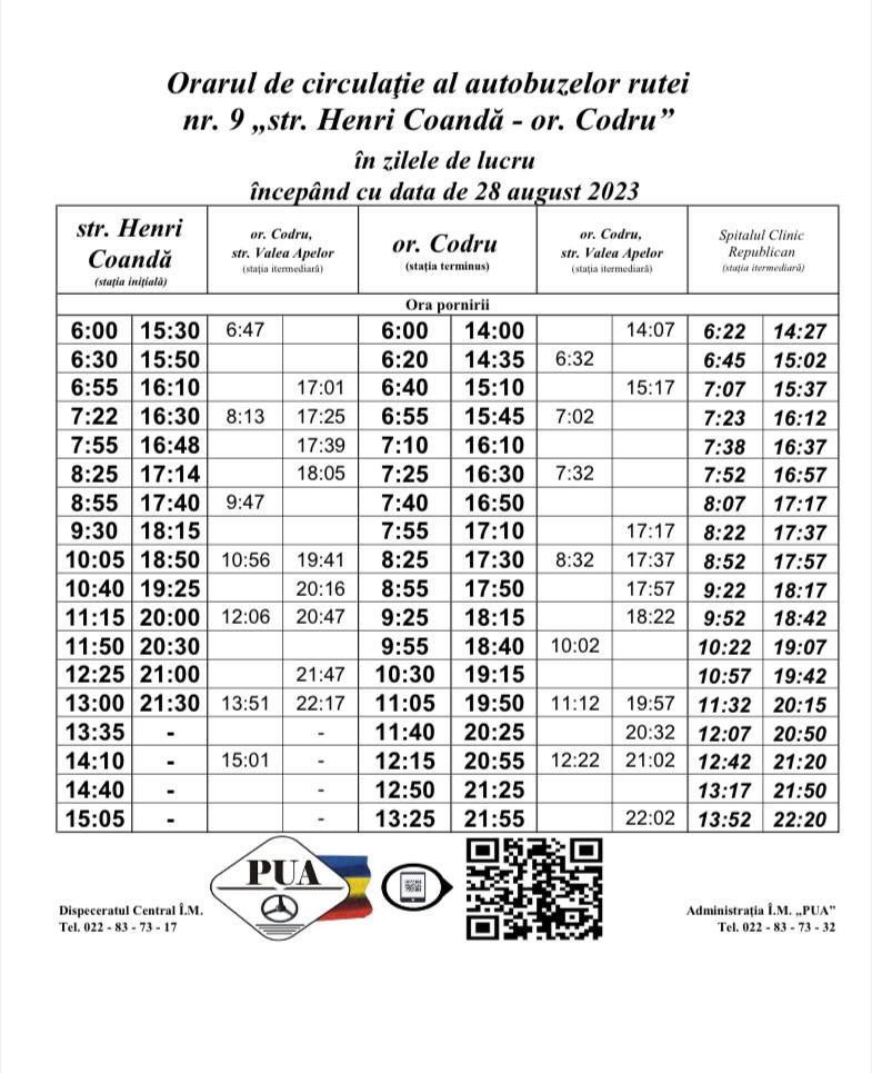 Din data de 28.08.2023 ruta de autobuz nr. 9 „str. Henri Coandă – or. Codru” își modifică orarul de circulație în zilele lucrătoare.