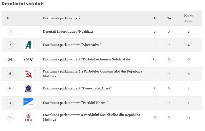 Voturile pentru Declarație au venit și partea a 54 de deputați PAS, 3 parlamentari de la „Alternativa”, 5 de la „Democrația Acasă” și 3 de la „Partidul Nostru”. Niciun deputat PCRM sau PSRM n-a votat pentru inițiativă.