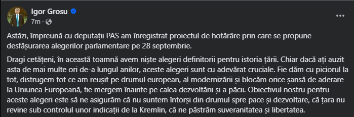 Un anunț în acest sens a fost făcut în această după-amiază de președintele Parlamentului Igor Grosu, tot el liderul PAS, formațiune care deține majoritatea parlamentară: „Astăzi, împreună cu deputații PAS am înregistrat proiectul de hotărâre prin care se propune desfășurarea alegerilor parlamentare pe 28 septembrie”.