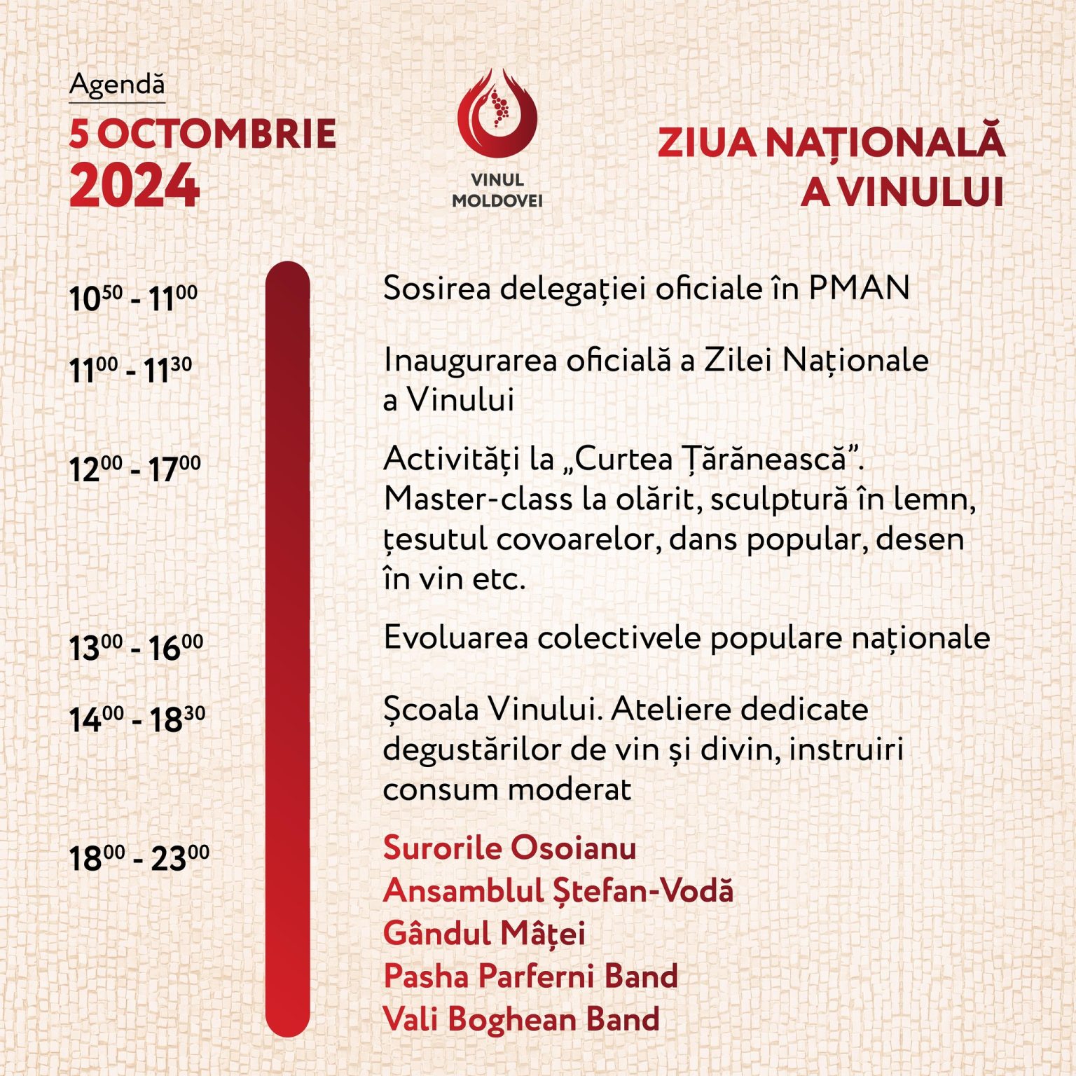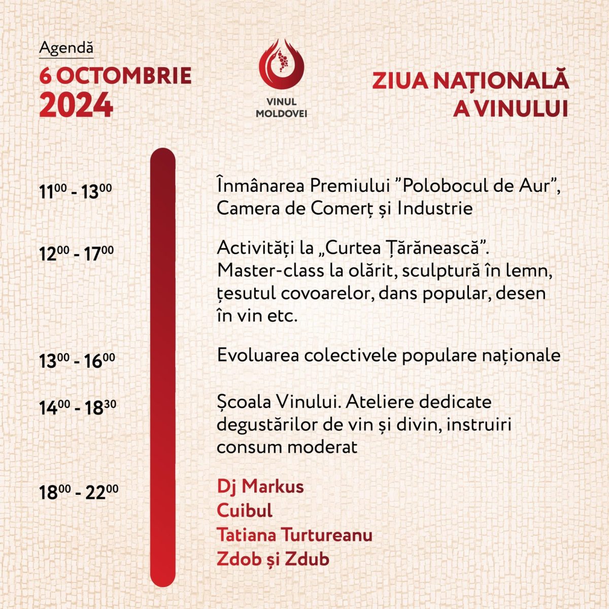 Ziua Națională a Vinului se va desfășura în perioada 5-6 octombrie în Piața Marii Adunări Naționale (PMAN) din capitală. Sloganul celei de-a 23-a ediții este „Vinul nostru uimitor de bun”. În acest an la sărbătoare vor participa 99 de vinificatori.