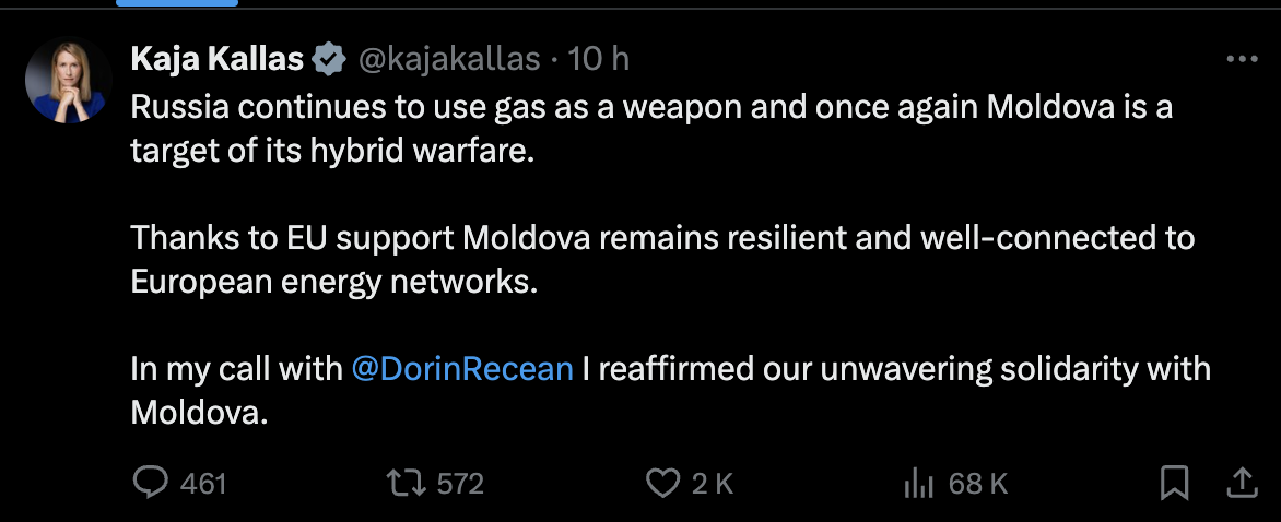 „Rusia continuă să folosească gazul ca armă și, din nou, Moldova este ținta războiului său hibrid. Datorită sprijinului Uniunii Europene, Moldova rămâne rezistentă și bine conectată la rețelele energetice europene. În apelul telefonic cu premierul Dorin Recean am reafirmat solidaritatea noastră neclintită pentru Moldova”, a subliniat Kaja Kallas.