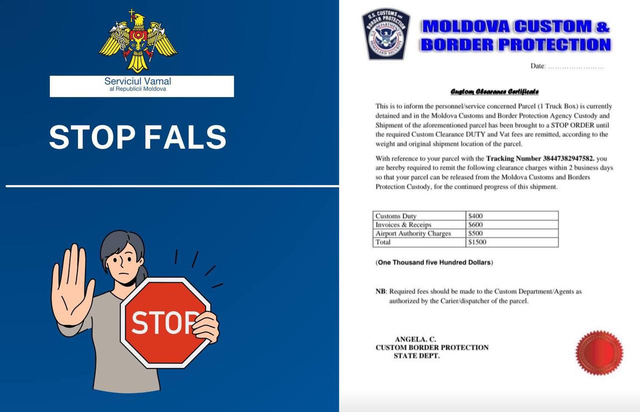 Serviciul Vamal al Republicii Moldova atrage atenția tuturor cetățenilor care așteaptă colete poștale asupra unei noi tentative de escrocherie. Aceasta implică transmiterea unor notificări cu conținut fals, inclusiv conturi de plată.