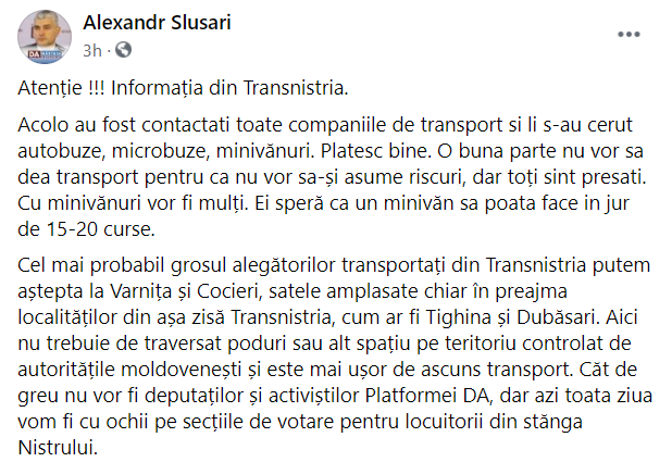 Vicepreședintele Platformei Demnitate și Adevăr, Alexandru Slusari, susține că reprezentanții companiilor de transport din regiunea transnistreană sunt presați pentru a transporta organizat alegători din stânga Nistrului la secțiile de votare de pe malul drept al Nistrului. Potrivit politicianului, cei care fac presiunile „plătesc bine”.