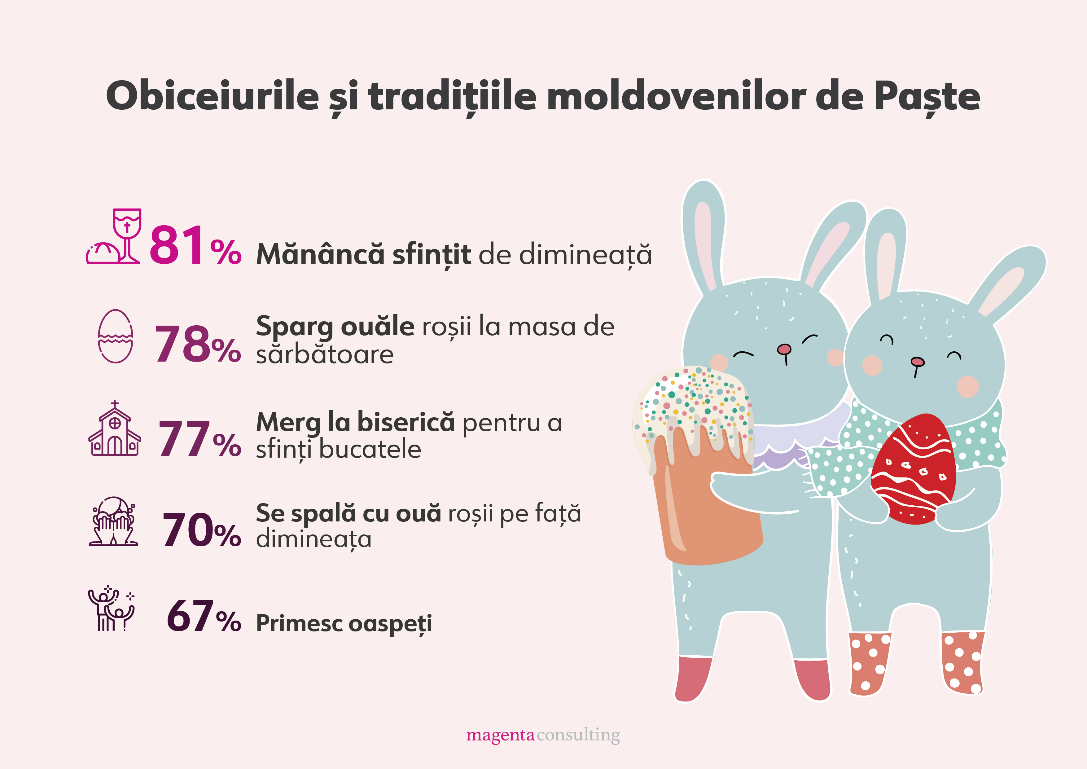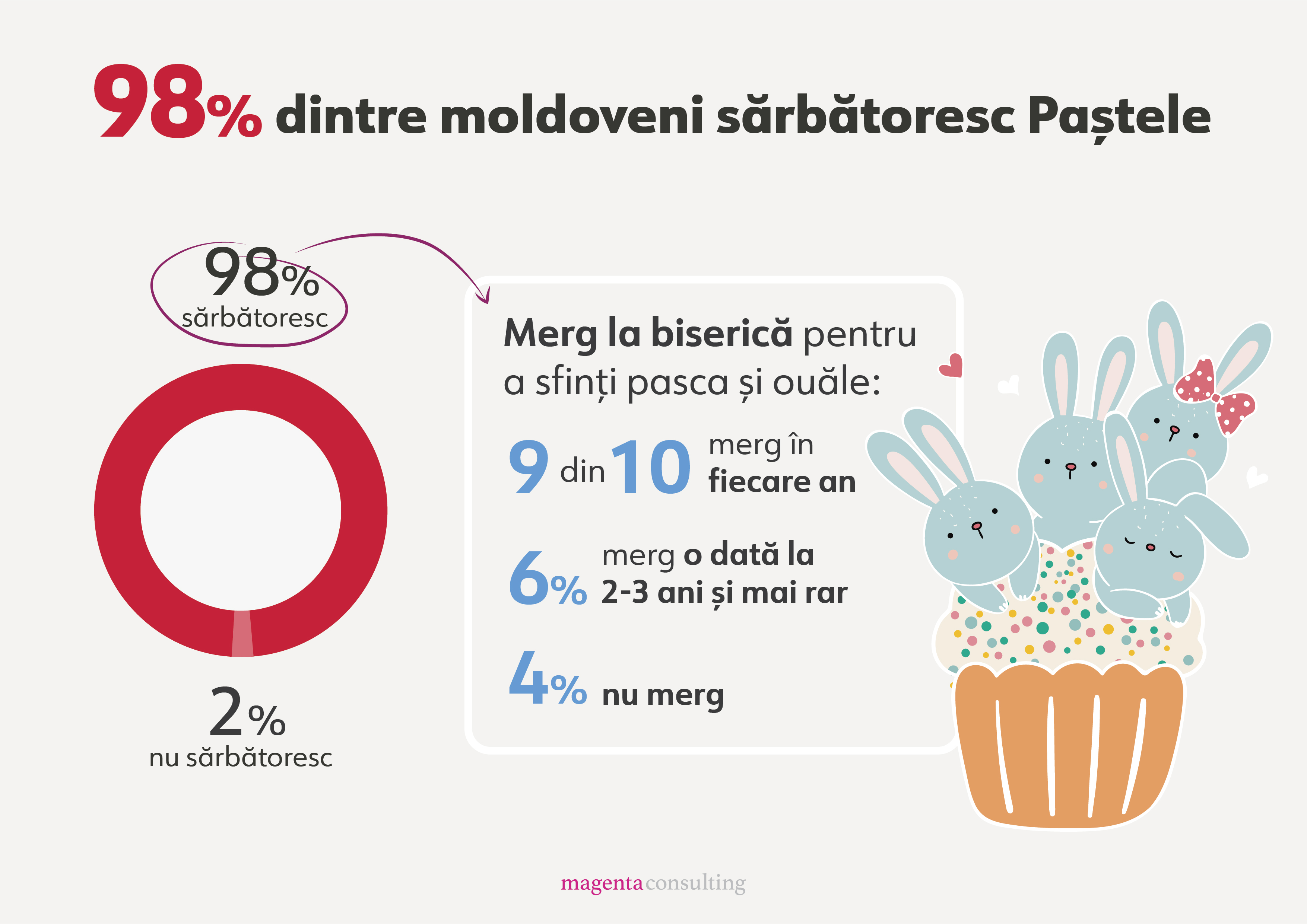 Doar doi moldoveni din 100 nu sărbătoresc Paștele, în timp ce 9 din 10 oameni merg la biserică în fiecare an pentru a sfinți pasca și ouăle. Datele fac parte din cel mai recent sondaj realizat de Magenta, care a confirmat faptul că mai mult de jumătate din cei care pășesc pragul locașurilor sunt femei.