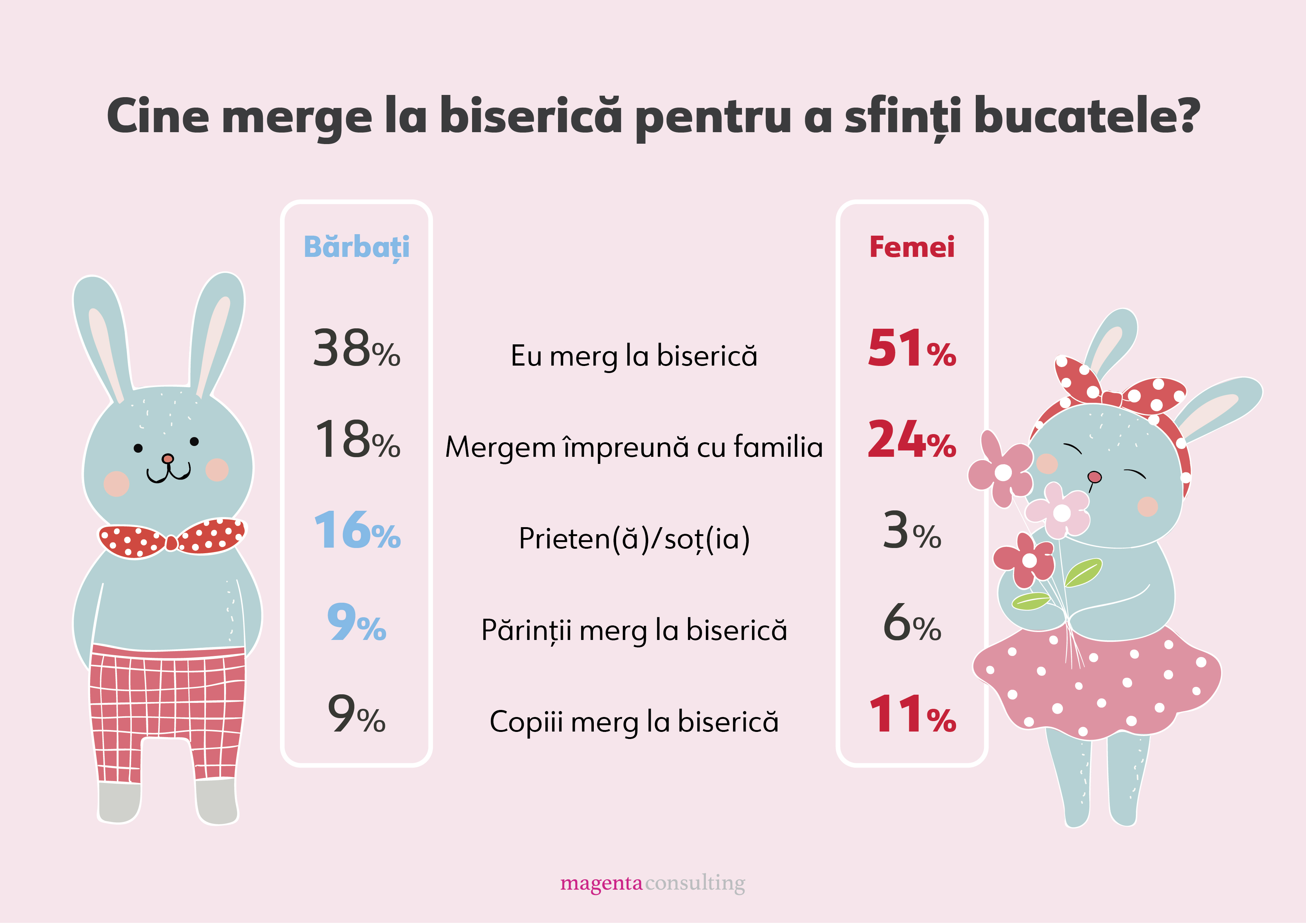 Pentru o zecime dintre respondenți, copiii merg la biserică să sfințească bucatele și tot atâția au menționat că partenerul de viață este cel responsabil de acest obicei. Doar 16% dintre bărbați spun că soția merge la biserică în dimineața Învierii, de 5 ori mai puține femei spun același lucru despre partenerii săi.
