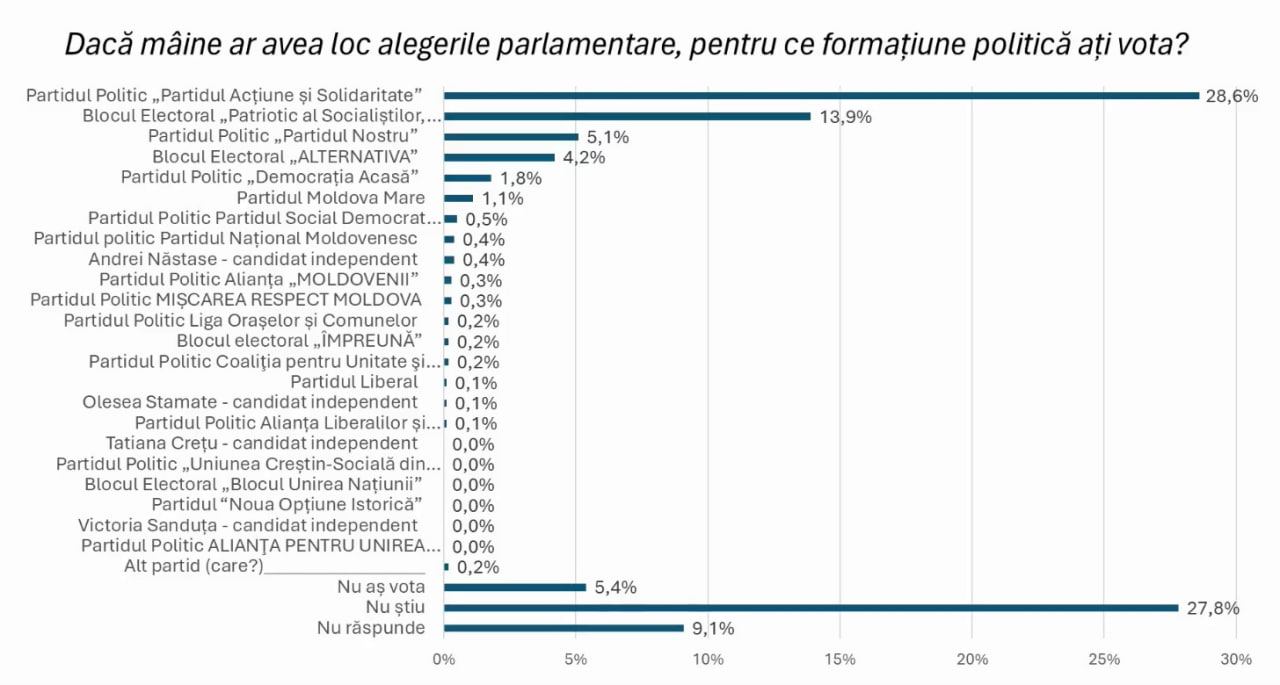 Sondajul mai arată că 5,4% dintre respondenți au declarat că nu ar vota, 27,8% nu știu cu cine ar vota, iar 9,1% au evitat să răspundă.