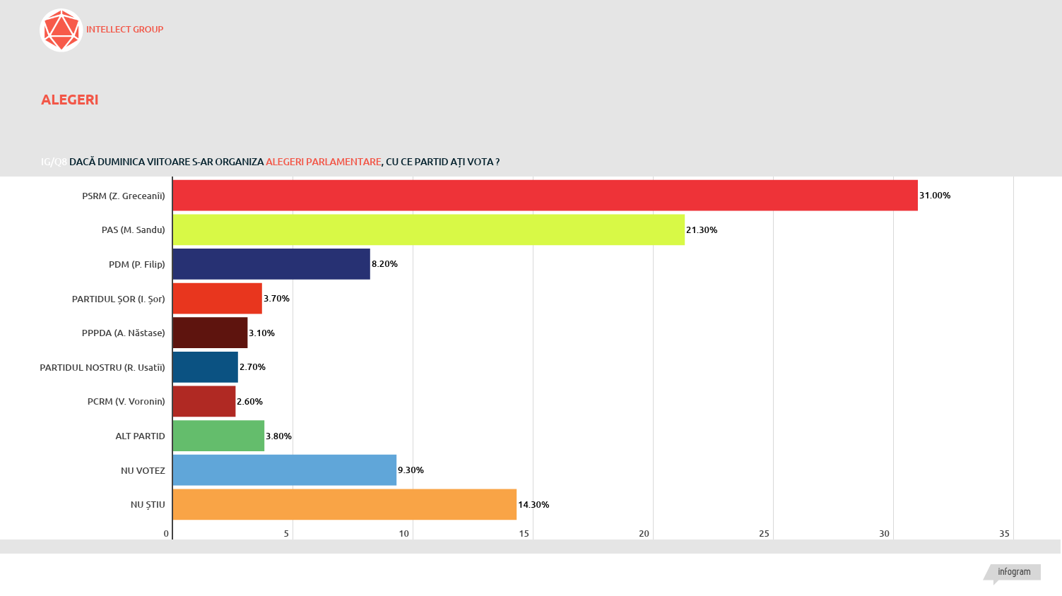 Potrivit studiului, PSRM ar obține 31% în cadrul scrutinului electoral, fiind urmat de PAS – cu 21,3% și PDM – cu 8,2%.