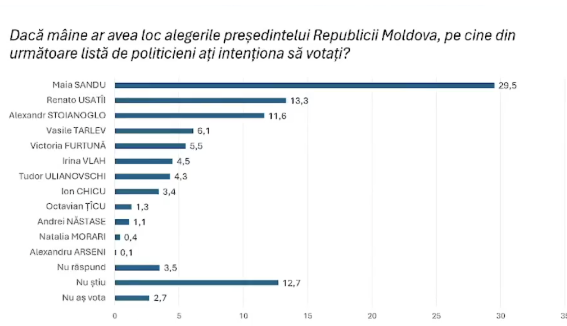 Potrivit studiului, actuala șefă a statului ar convinge 29,5% din respondenți, iar președintele formațiunii politice Partidul Nostru, Renato Usatîi, ar ocupa poziția a doua în topul preferințelor moldovenilor, cu 13,3%.