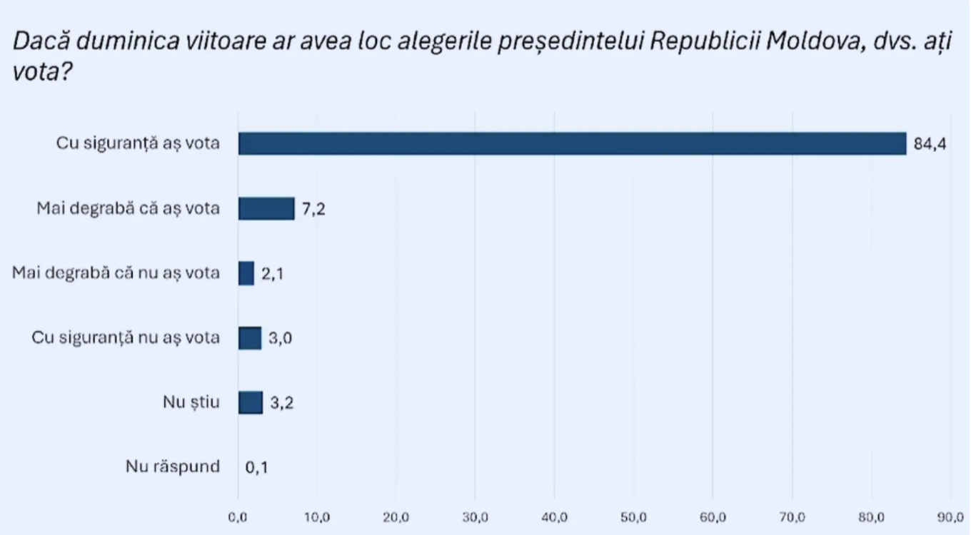 Datele aceluiași sondaj mai arată că intenția de participare la alegerile prezidențiale este ridicată. Mai exact, 84,4% dintre respondenți au declarat că vor vota cu siguranță la alegerile șefului statului. Alți 7,2% au indicat că mai degrabă ar vota.