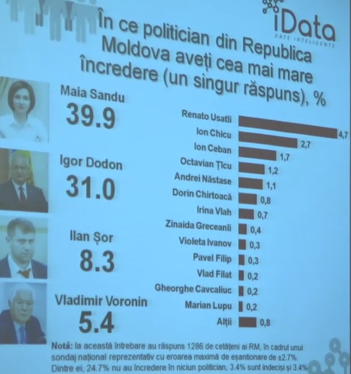 Rezultatele arată că respondenții au încredere cel mai mult în Maia Sandu (39,9% din respondenți), Igor Dodon (31%) Ilan Șor (8,3%) și Vladimir Voronin (5,4%).