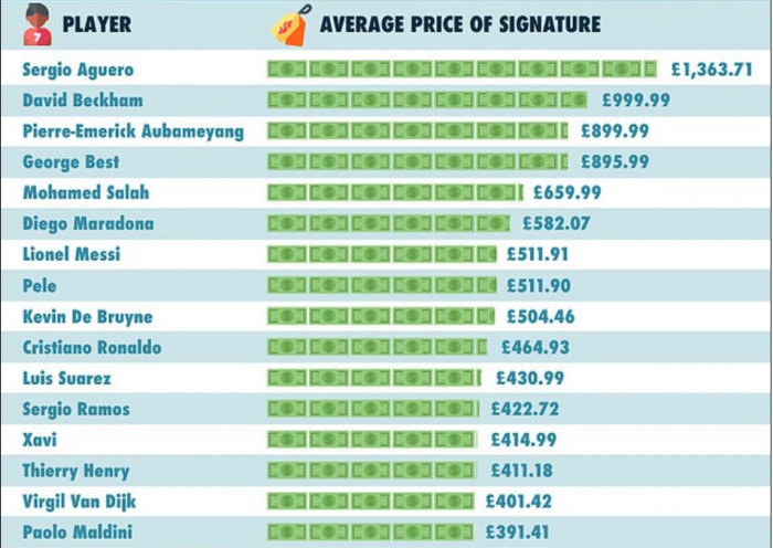 Pentru semnătura lui Sergio Aguero se plătește în jur de 1500 de euro, iar pe locul doi este David Beckham, a cărui faimă rămâne intactă și după retragere. Autograful fostului star de la Manchester United și Real Madrid costă în jur de 1100 de euro.