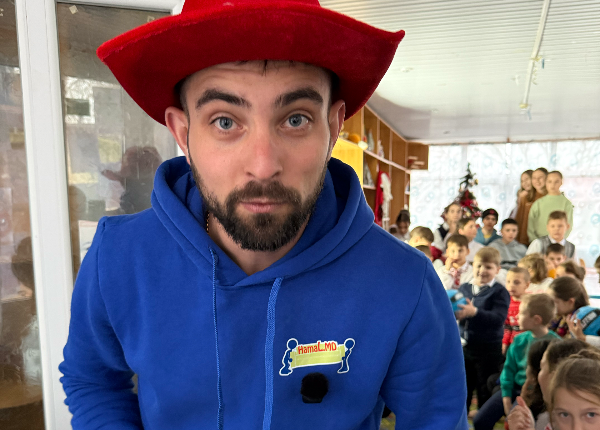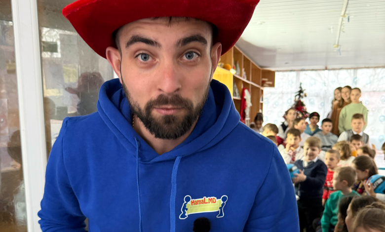 Moș Crăciun nu a venit cu sania și renii, ci cu o mașină branduită Hamal.md, din care au coborât doi hamali… cu două căciuli amuzante, zâmbind larg. Un detaliu mic, dar suficient ca să spargă emoțiile și să stârnească râsete sincere încă de la primele secunde.