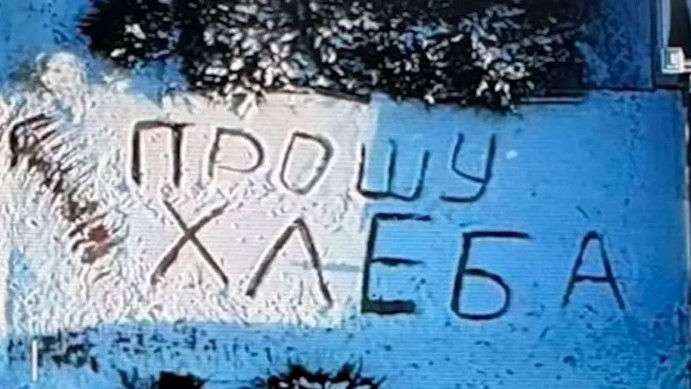 În imaginile filmate din dronă se văd blocuri de locuințe complet distruse, iar la un moment dat camera fixează mesajul scris în zăpadă: „Vă rog, pâine”.