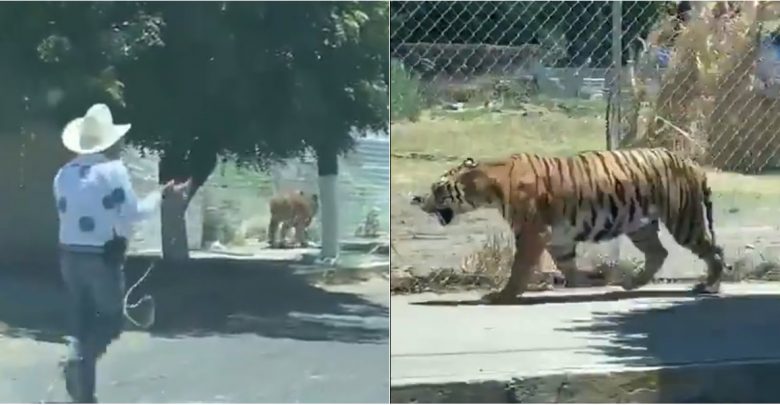Un tigre que se paseaba por las calles de Jalisco fue atrapado por un hombre con sombrero y camisa blanca, que traía un lazo. https://t.co/AIUtkKWqkB